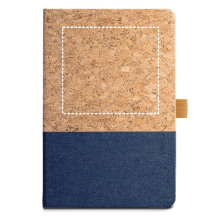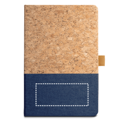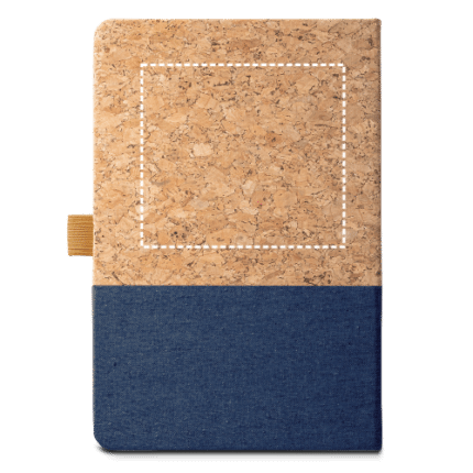 A5 notepad with cork cover and linen at the bottom of the cover. This notepad has 192 lined ivory pages from a sustainable forest management and pen holder (pen not included). Supplied in kraft paper envelope with customisable sticker. 140 x 210 mm