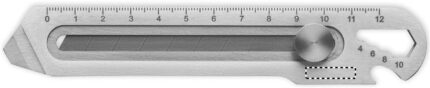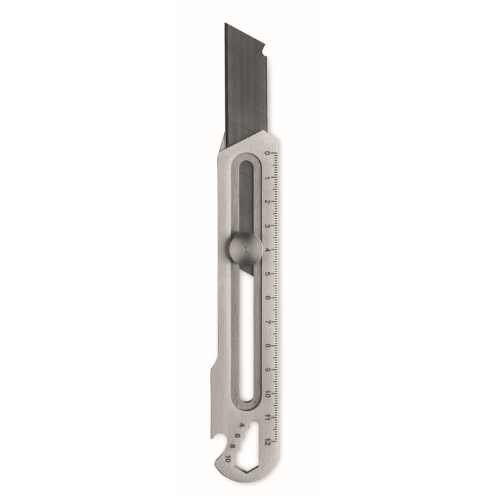 Stainless steel retractable knife with 8 carbon steel blades, bottle opener, wrench and ruler.