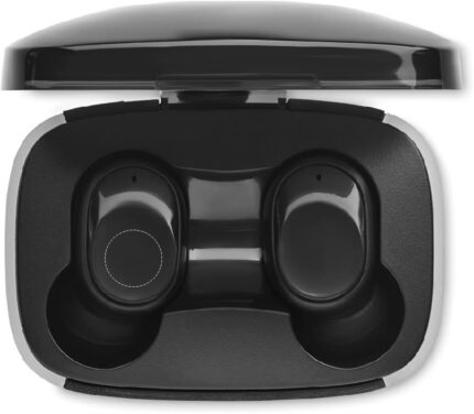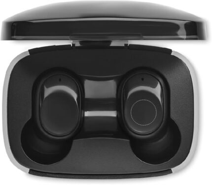 Set of 2 True Wireless Stereo (TWS) 5.0 earbuds with 25 mAh battery built-in. Playing time approx. 3 hours. Including a micro USB charging cable and a 180 mAh charging station.