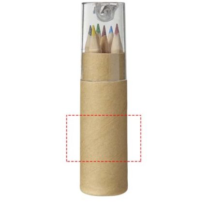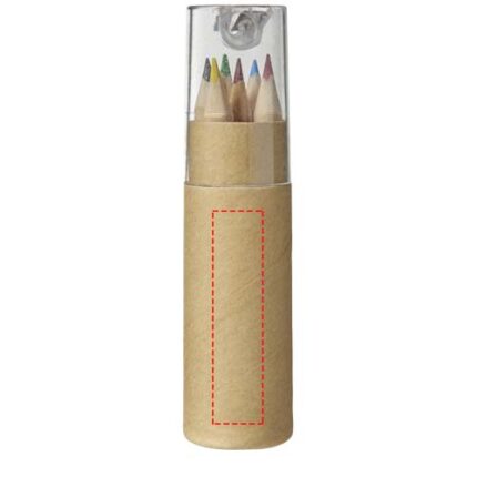 6 coloured pencils in cardboard cylinder box with sharpener in plastic lid. Decoration not available on components.