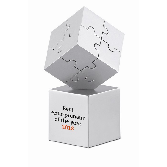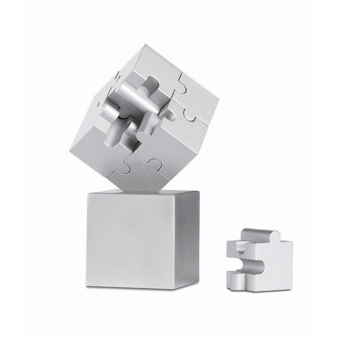 3D puzzle composed of magnetic, metallic pieces. Can also be used as paper weight.