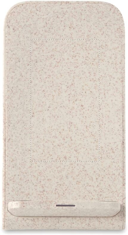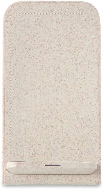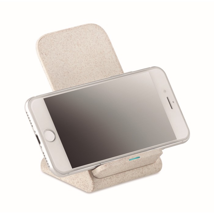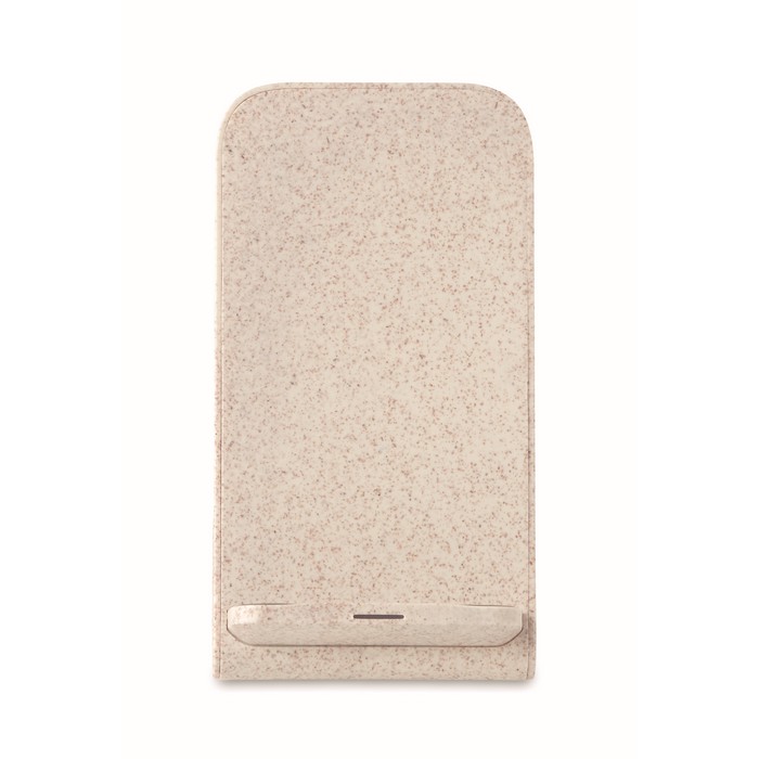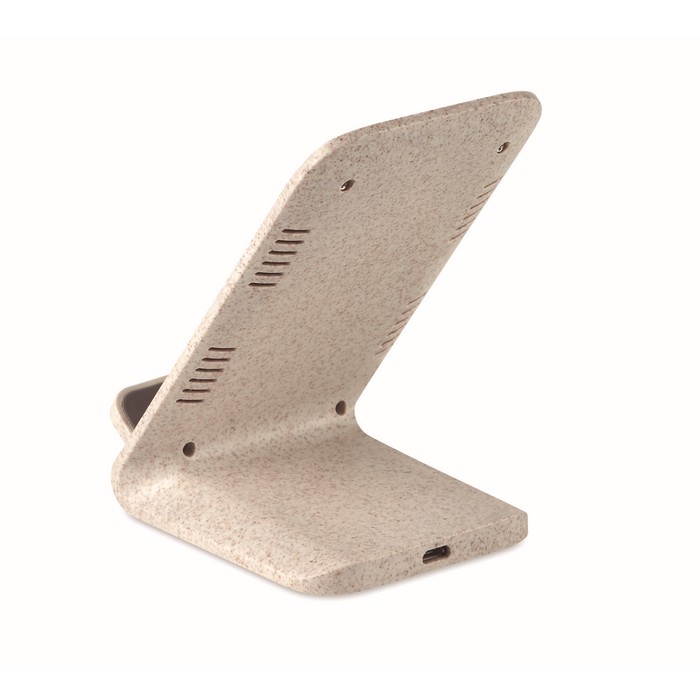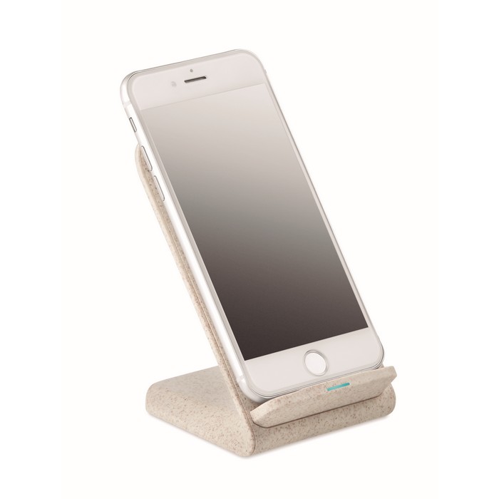 Double coil wireless charger stand. 35% wheat straw and 65% ABS. Place smartphone on it to begin charging. Output: DC5V/2A (10W) for quick charging. Compatible with latest Androids, iPhone® 8, X and newer.