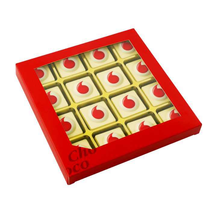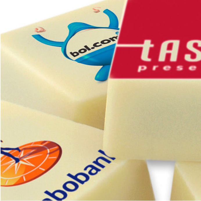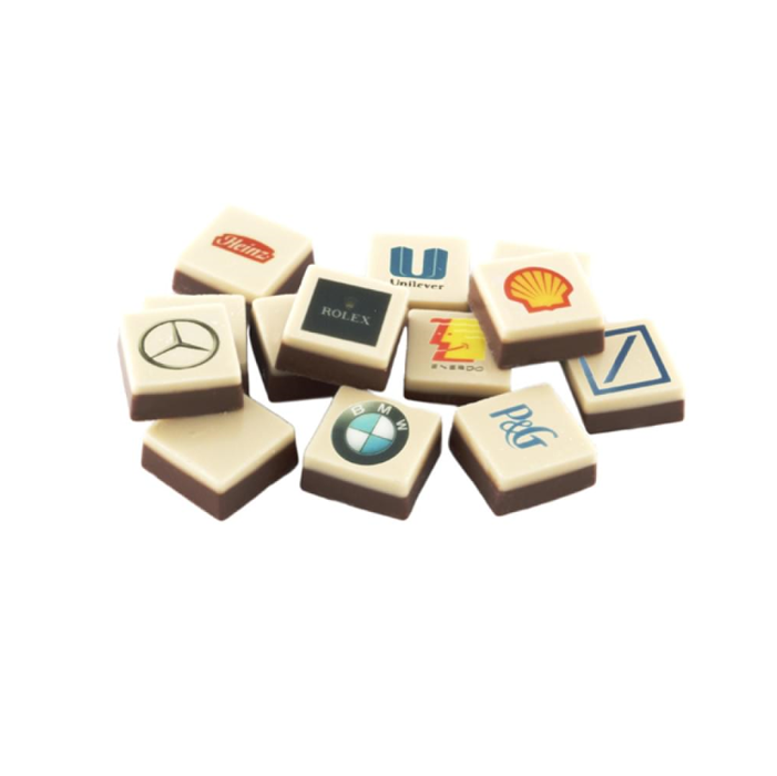 Μια λευκή σοκολάτα με τις σοκολάτες Logo Customize it, ιδανική για εταιρικά δώρα και διαφημιστικούς σκοπούς.