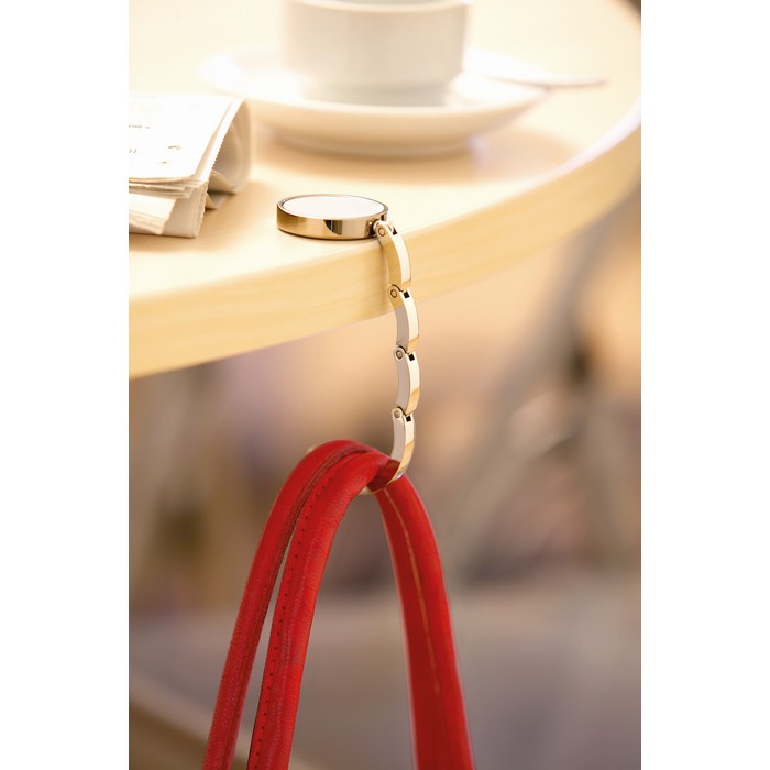 Elegant handbag holder with a segmented foldable hook for perfect adjustment.