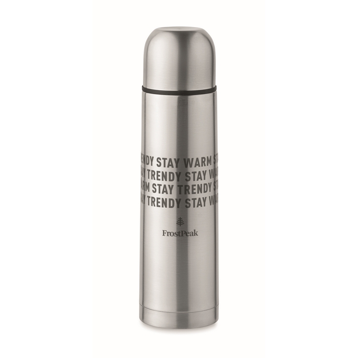 Double wall recycled stainless steel (90% recycled stainless and 10% stainless steel) insulated vacuum bottle. Leak-free. Capacity: 500 ml.