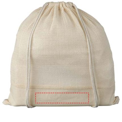Fruits and vegetables reusable backpack made of cotton mesh. Features a large main compartment with drawstring closure. Resistance up to 5 kg weight.