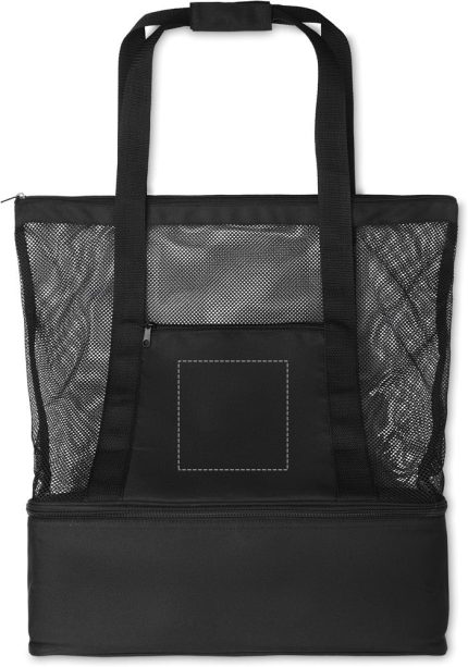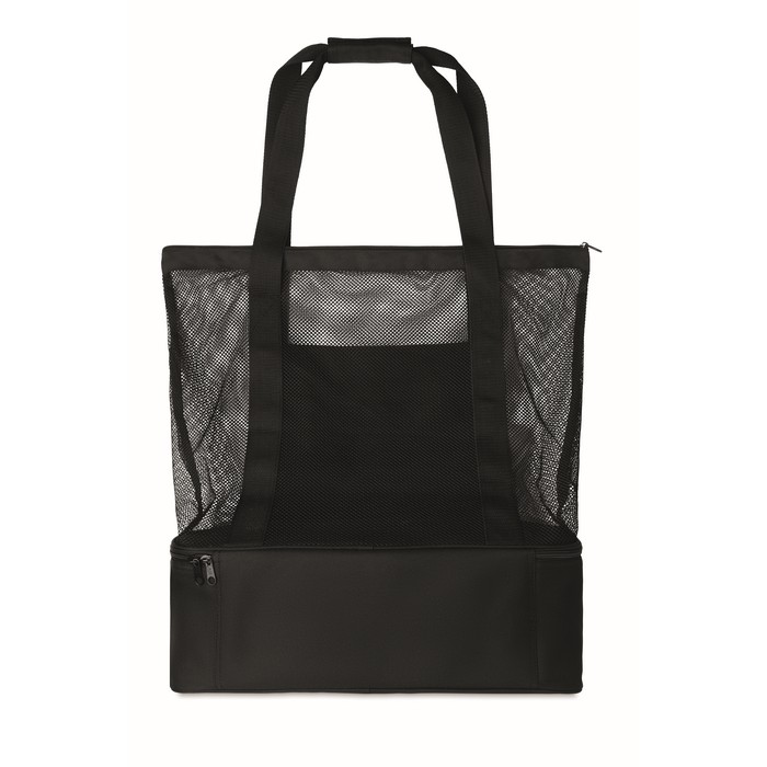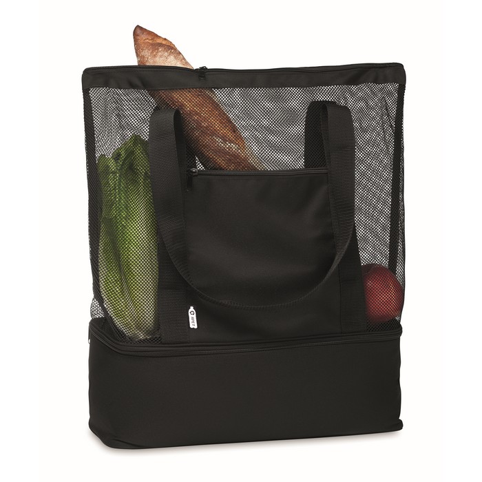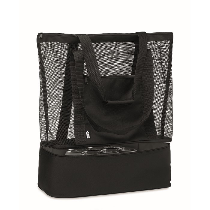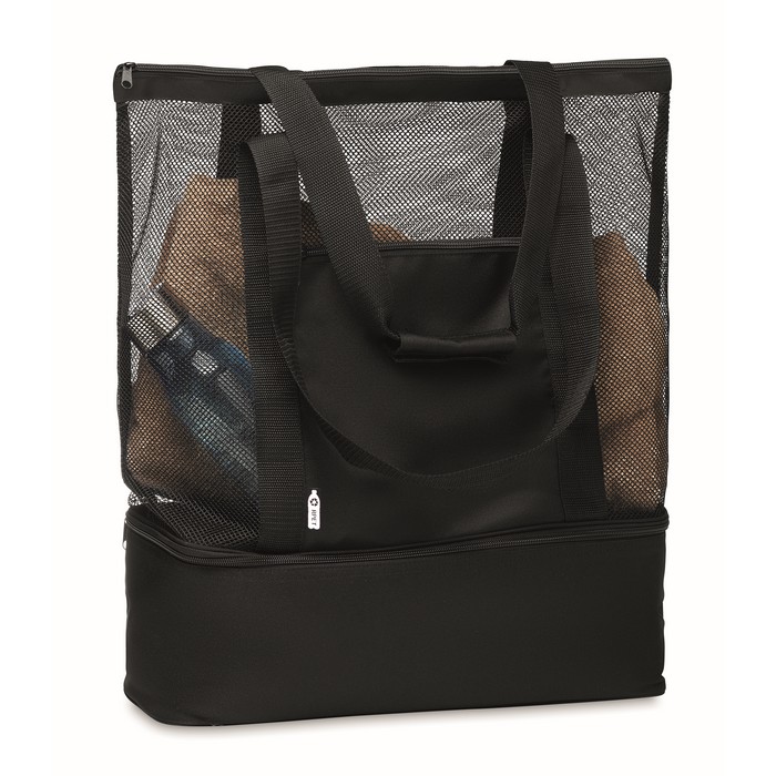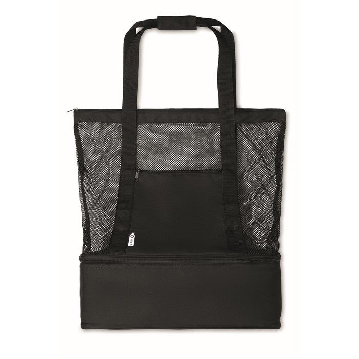 Shopping bag or beach bag with long handles in 600D RPET with RPET mesh and front zipper pocket. Cooler compartment at the bottom.