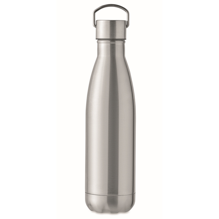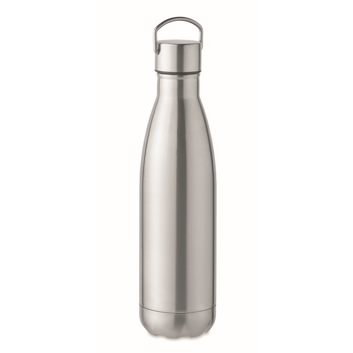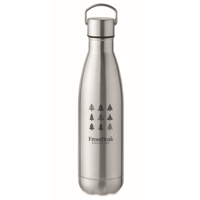 Double wall recycled stainless steel (90% recycled stainless and 10% stainless steel) insulated vacuum bottle handle lid. Leak-free. Capacity: 500 ml.