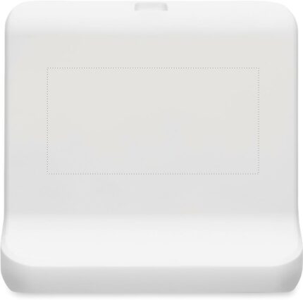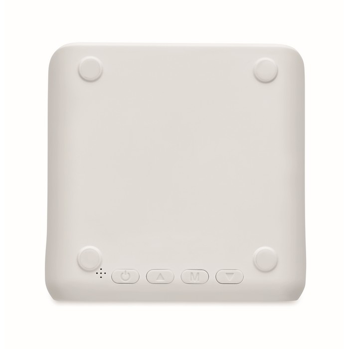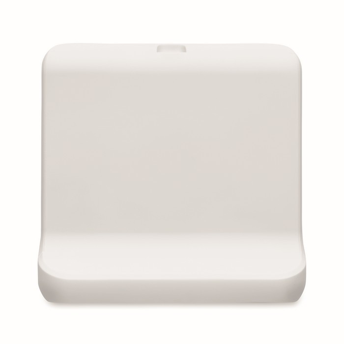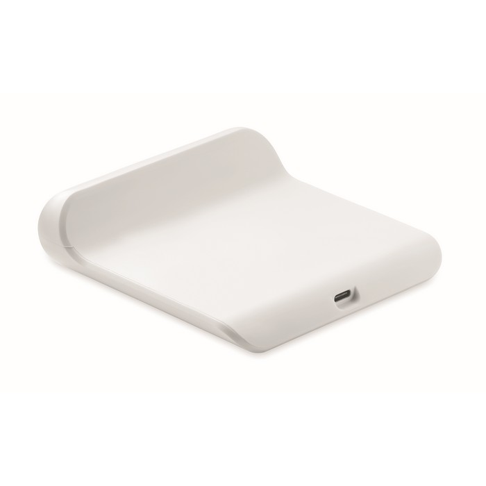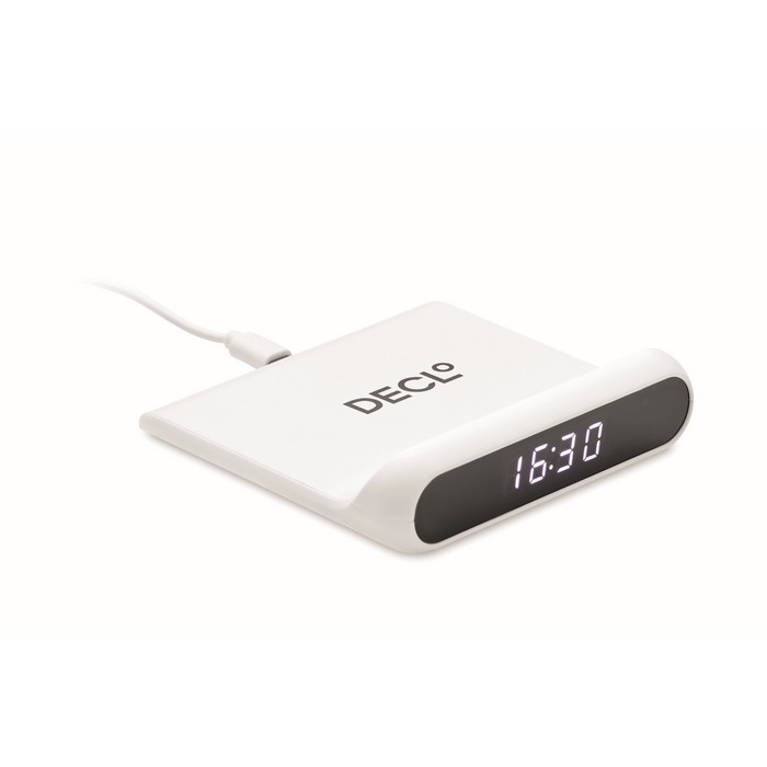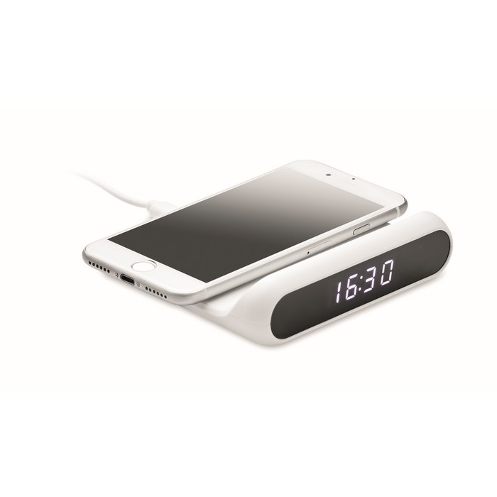 10W wireless charger device including white LED time display alarm clock in ABS casing. Contains USB charging cable with type C. Output: DC 9V/1.10A (10W) for quick charging. Compatible with latest Androids, iPhone® 8, X and newer.