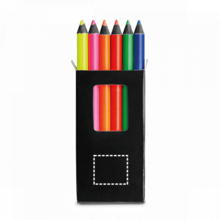 Box with 6 small fluorescent wooden colouring pencils. 90 x 10 x 48 mm