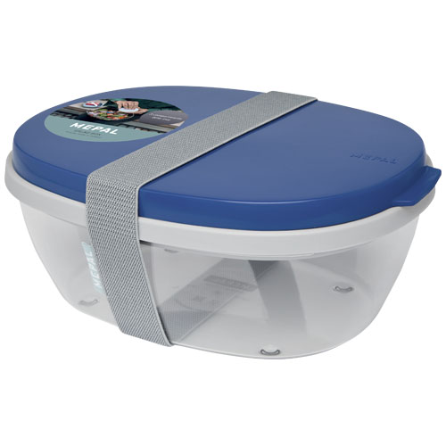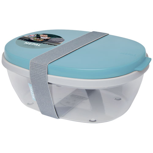 Salad box with large 1300 ml transparent compartment that is big enough to mix the salad at the time of eating. The top compartment offers space for bread or cutlery. Includes a small compartment for dressing or nuts. Unbreakable and dishwasher safe. Comes with an elastic band closure. BPA free. 2 years Mepal warranty.