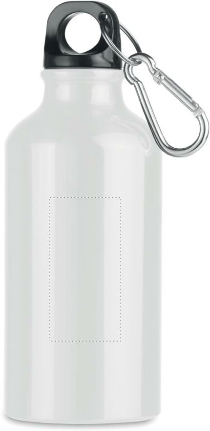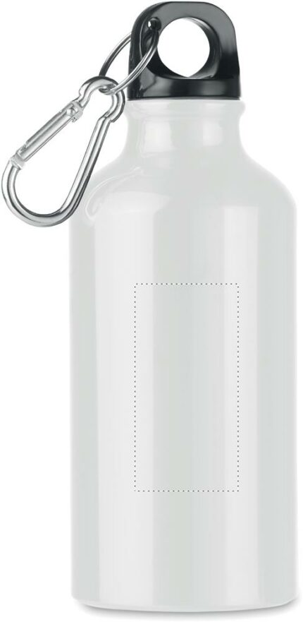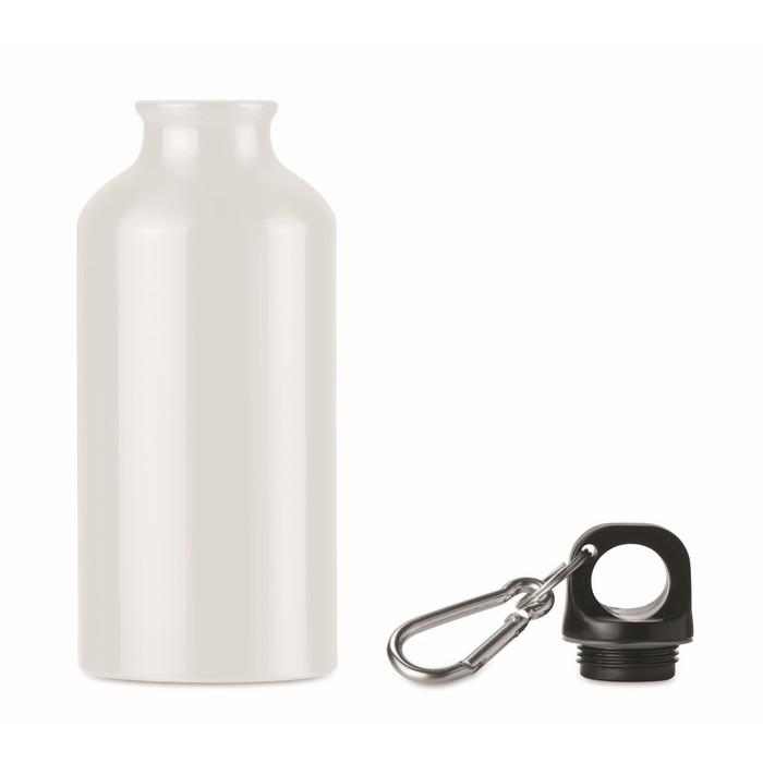 Aluminium single layer bottle with carabiner. 400 ml. Sublimation print available on white item only. Leak free.