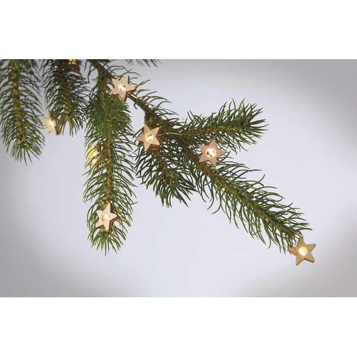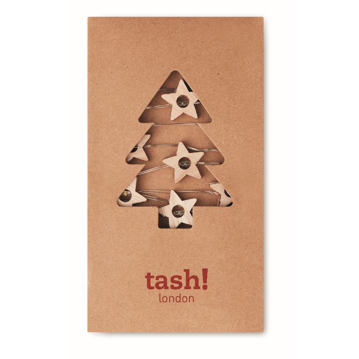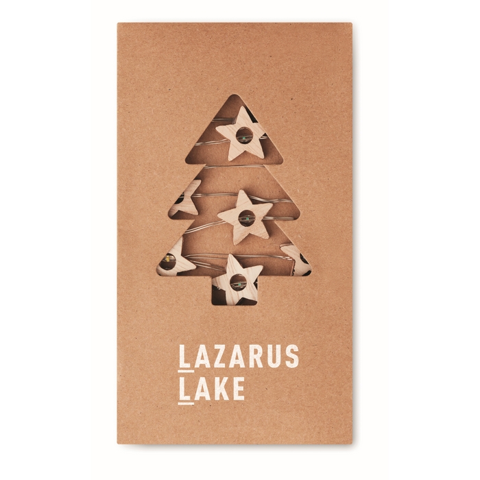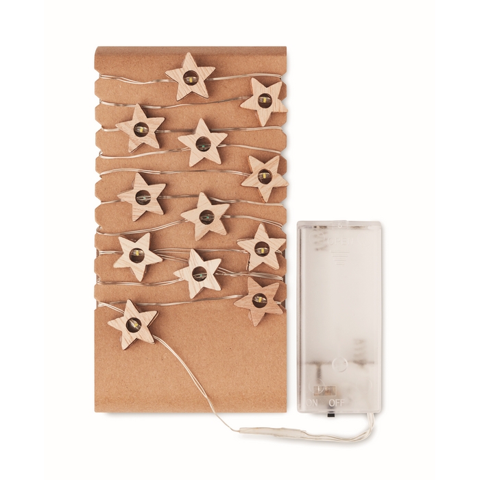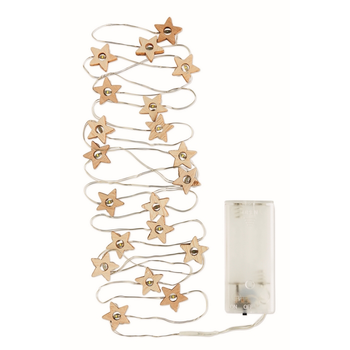 String with 20 LED lights in wooden star shape. Presented in carton box. 2 AA batteries not included. On/off button in battery case.