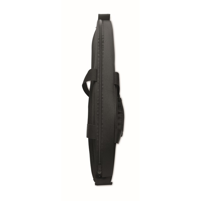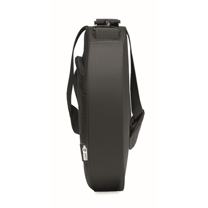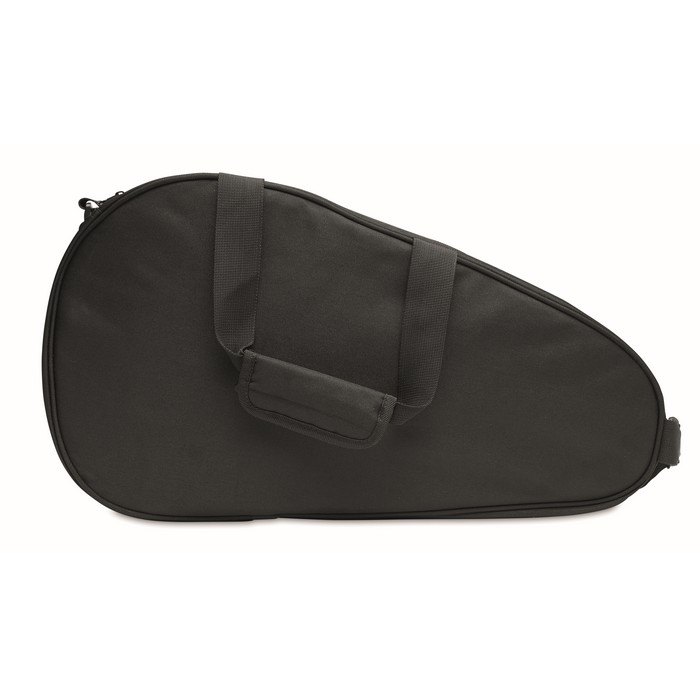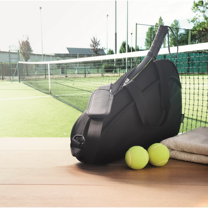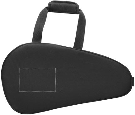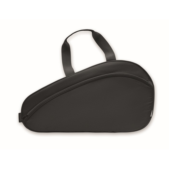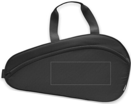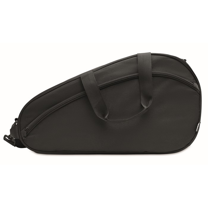 Single paddle racket carry bag in 600D padded RPET. Includes adjustable shoulder strap. Additional zippered front pocket.