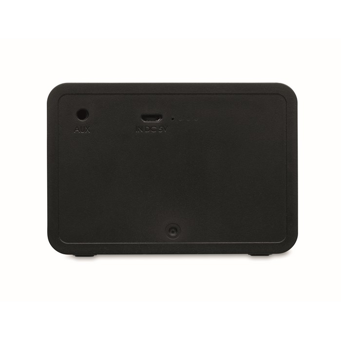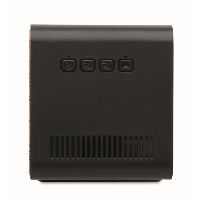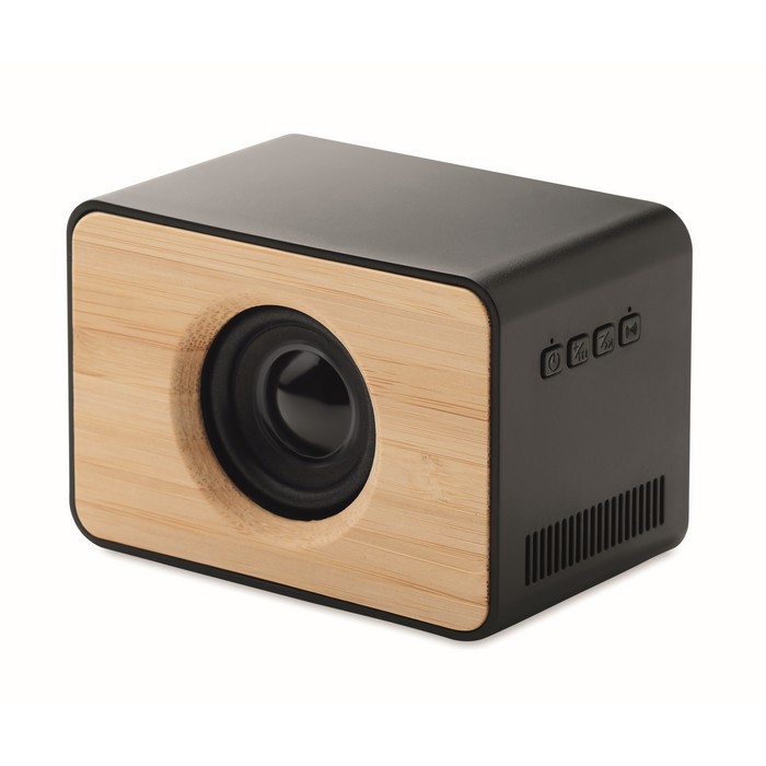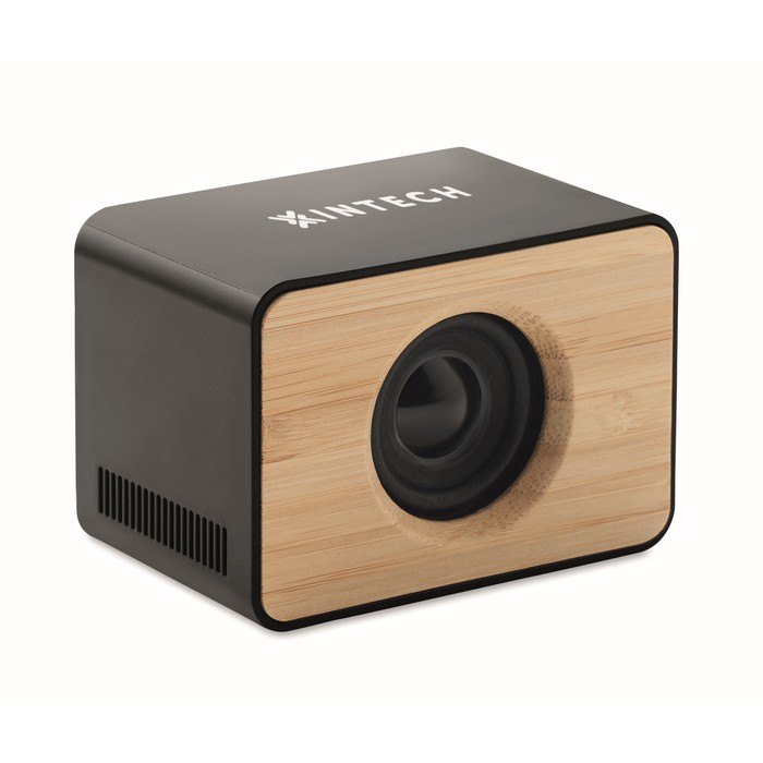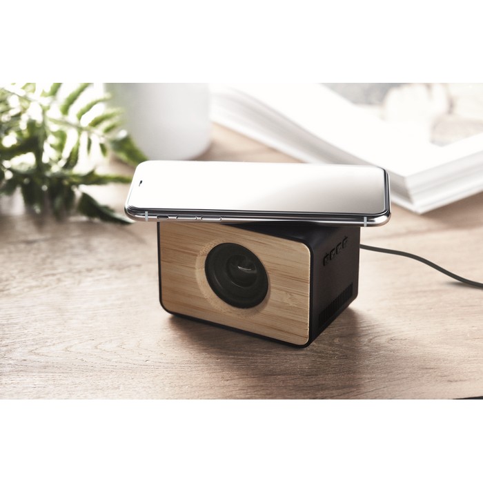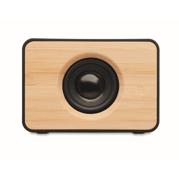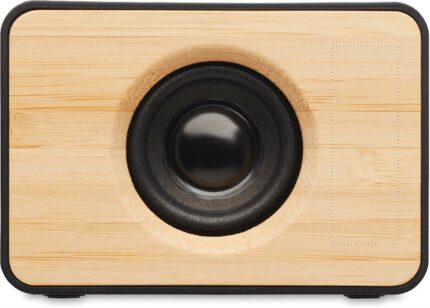 5.0 wireless speaker in Bamboo front, ABS back and 10W wireless charger. Connect device to your computer, place smartphone on charging area to charge. 1 Rechargeable Li-Ion 1800 mAh battery. Output data: 3W, 4 Ohm. Playing time approx. 2h.