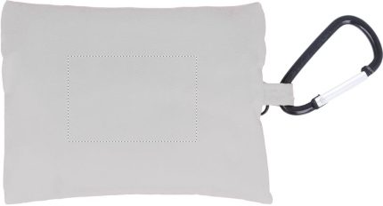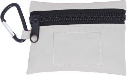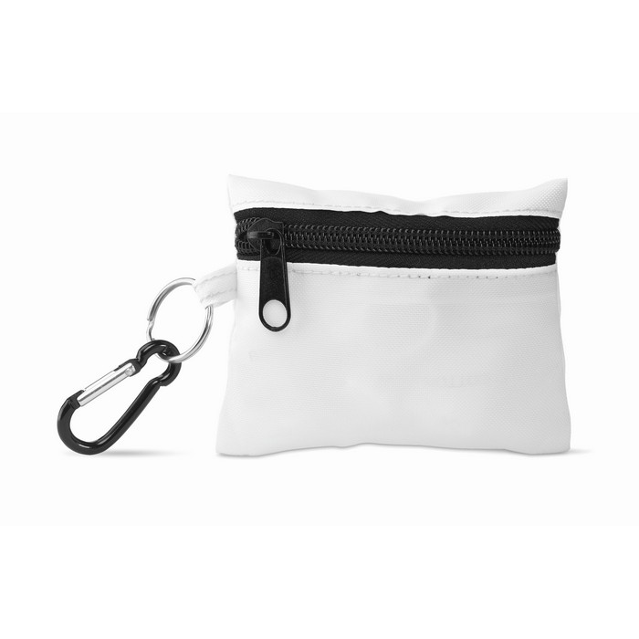 Emergency first aid kit including scissors, a wet wipe, a gauze bandage, 3 cotton buds and 5pcs adhesive bandages. All packed in a polyester pouch with carabiner.