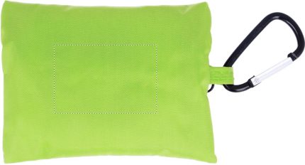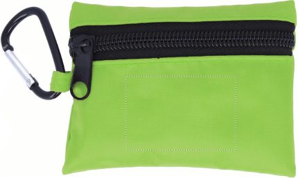 Emergency first aid kit including scissors, a wet wipe, a gauze bandage, 3 cotton buds and 5 pcs adhesive bandages. All packed in a neon polyester pouch with carabiner.