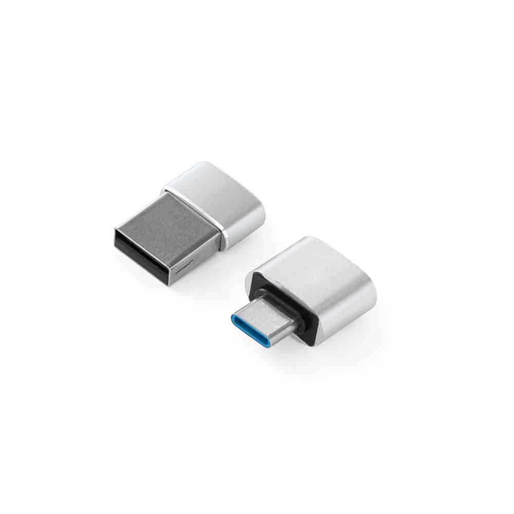 Aluminium adapter set that contains 1 adapter from USB-A to USB-C and 1 adapter from USB-C to USB-A. USB 2’0 technology. Supplied in individual PP case. 37 x 40 x 18 mm