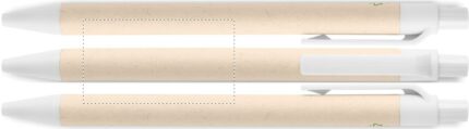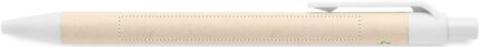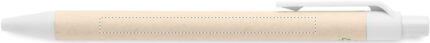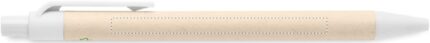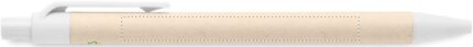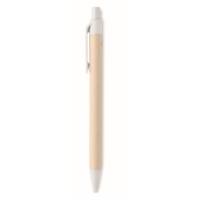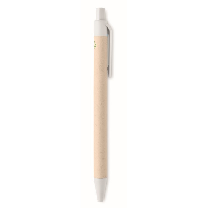 Push button ball pen with recycled milk cartons barrel (70 % recycled milk carton and 30% recycled paper) and PLA parts (in 100% biodegradable corn). Blue ink.