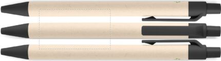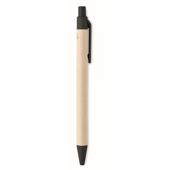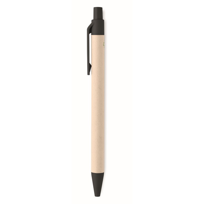 Push button ball pen with recycled milk cartons barrel (70 % recycled milk carton and 30% recycled paper) and PLA parts (in 100% biodegradable corn). Blue ink.