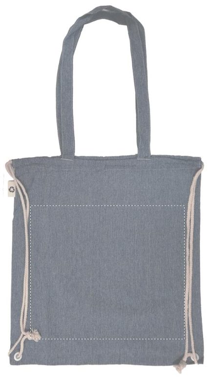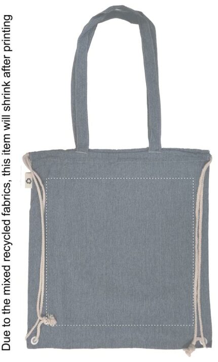 2 tone recycled cotton and recycled polyester shopping bag with drawstring and long handles. Approx. 140 gr/m². This item can shrink after printing.