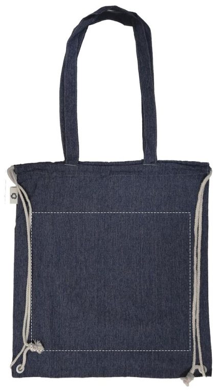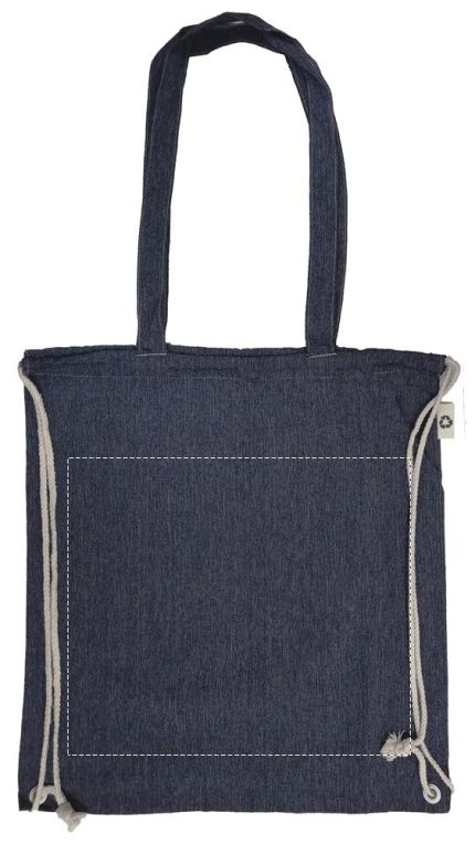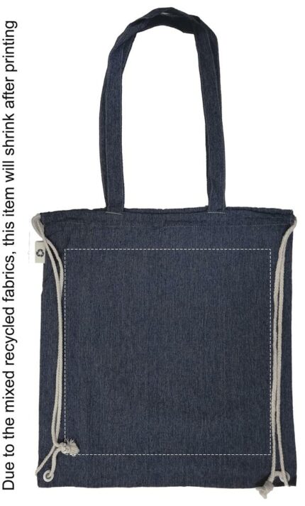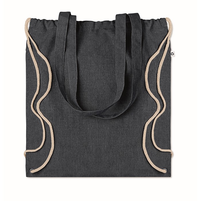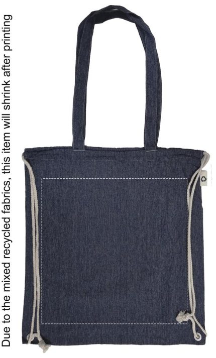 2 tone recycled cotton and recycled polyester shopping bag with drawstring and long handles. Approx. 140 gr/m². This item can shrink after printing.