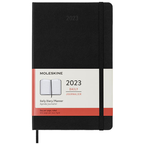 Hard cover Moleskine daily planner for January to December 2023, formatted to show each day on its own page. Has adhesive labels inside to mark important dates and deadlines. The planner comes with useful tools such as time zones, international measurements, dialing codes, and flight durations. Features 70 g/m² ivory-colored acid-free paper, a black elastic closure, page ribbon marker, and an expandable inner pocket. Leatherette paper.