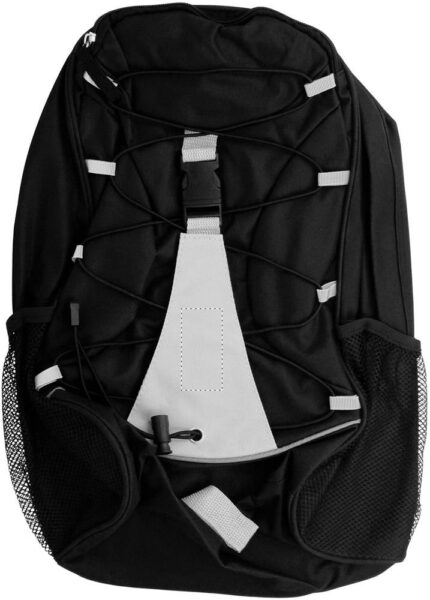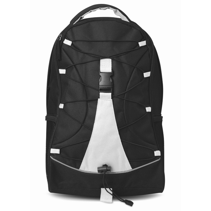 Backpack in 600D polyester with colourful contrasting facing and decorating cord on the front panel. Mesh pockets on both sides.