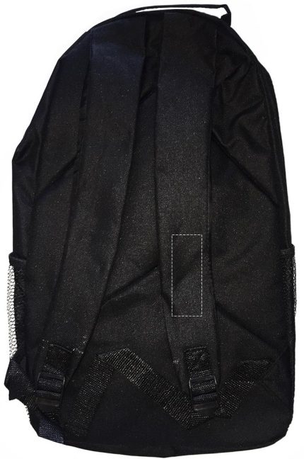 Backpack in 600D polyester with colourful contrasting facing and decorating cord on the front panel. Mesh pockets on both sides.