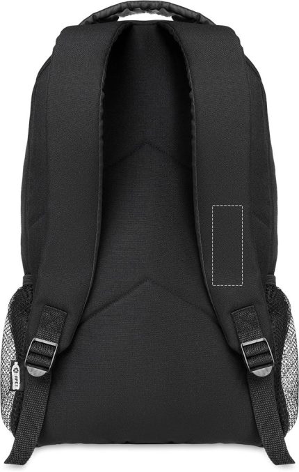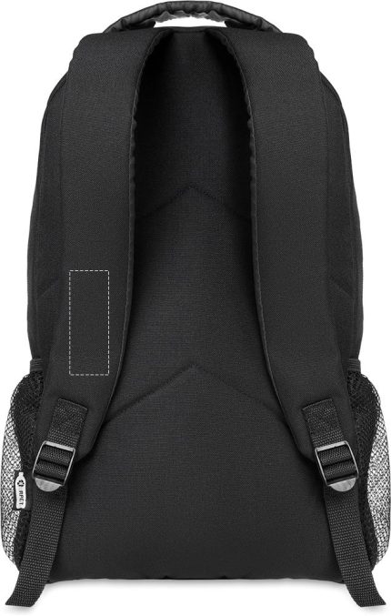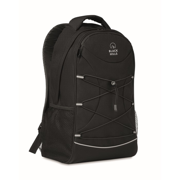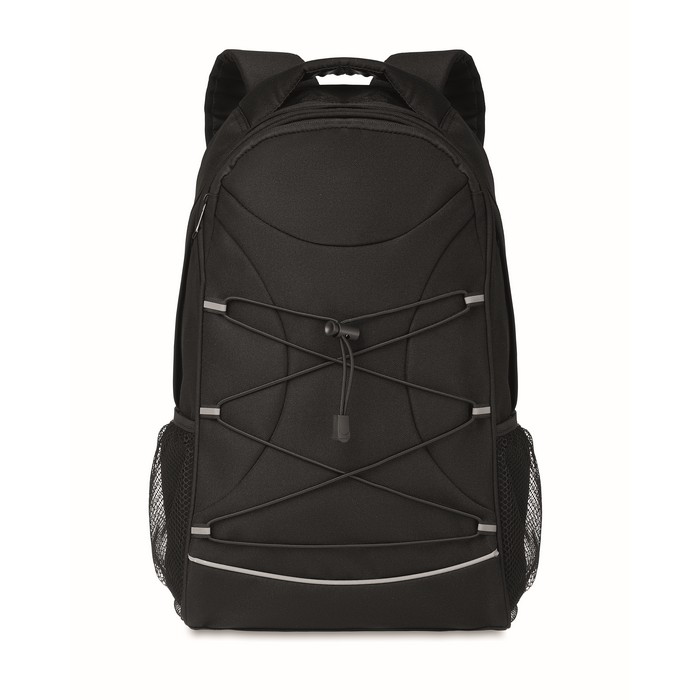 Backpack in 600D RPET with dark cords in front and reflective front panel feature. Mesh pockets on both sides.