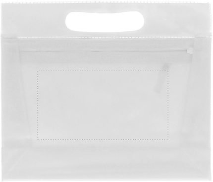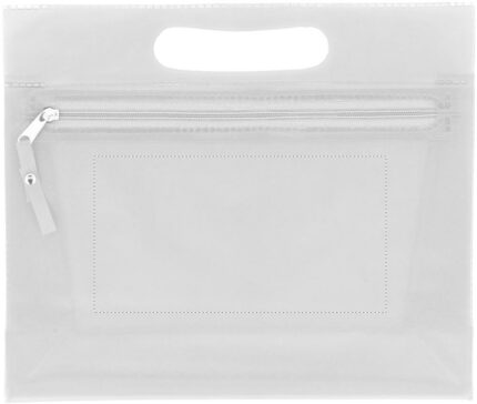 Transparent PVC cosmetic pouch with zipper.