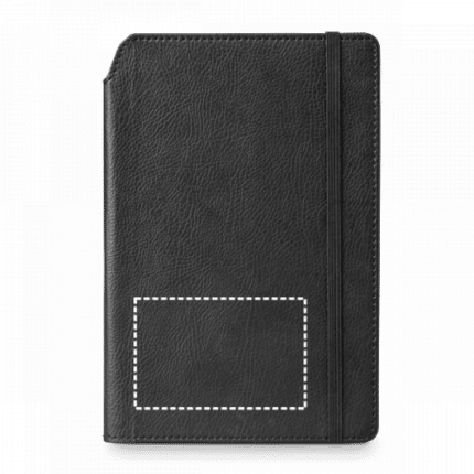 A5 notepad with hardcover in imitation leather. This notepad has 192 lined pages, pen holder (pen not included) and elastic band. 140 x 210 mm