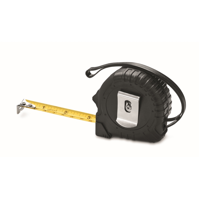 3M measuring tape in recycled ABS. Including hand strap and silver metal clip.