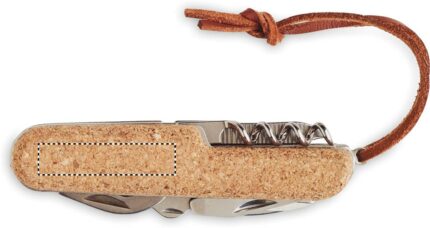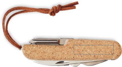 Stainless steel multi-function pocket knife with a cork cover and PU cord. 7 functions. It includes 2 openers, knife, scissor, screwdriver with Philips tips, file and wine opener. Cork is a natural product, there may be slight variations in colour and size per item, which can affect the final decoration outcome.