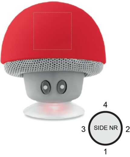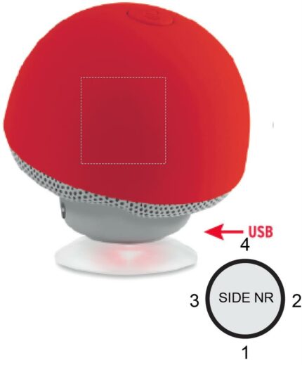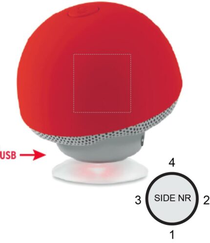 Mushroom shaped 5.0 wireless speaker/phone stand in ABS with suction cup. 1 Rechargeable Lithium 180 mAh battery included. Including USB charging cable and 3,5 mm plug. Output data: 4 Ohm, 5V and 3W. Playing time aprox. 2h.