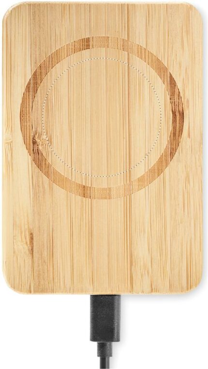 Magnetic bamboo wireless charger with car mount. Output: DC 9V/1.67A (15W) for quick charging. Compatible with iPhone® 12 and newer. Including additional magnetic metal ring to support charging of other non-magnetic wireless chargeable phones.