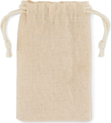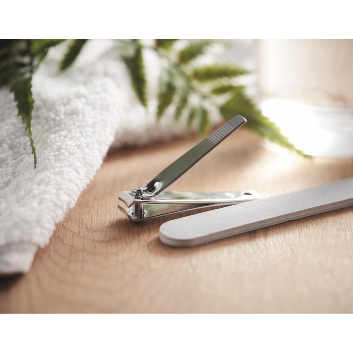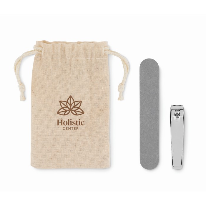 Manicure set in a cotton drawcord pouch. Includes a nail file and a nail clippers.