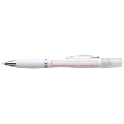 Ballpoint pen with a refillable sprayer and protective cap on top. The sprayer can be filled with alcohol or other cleaning liquid to sanitize hands and/or disinfect surfaces while on the go. Simply unscrew the spray nozzle to fill. Sprayer capacity 3 ml. Liquid not included.