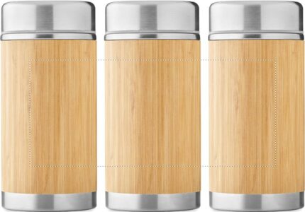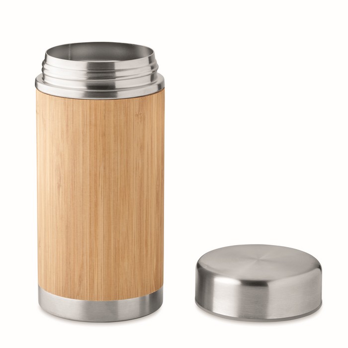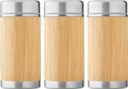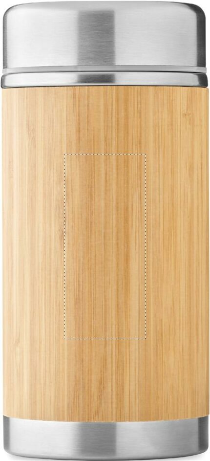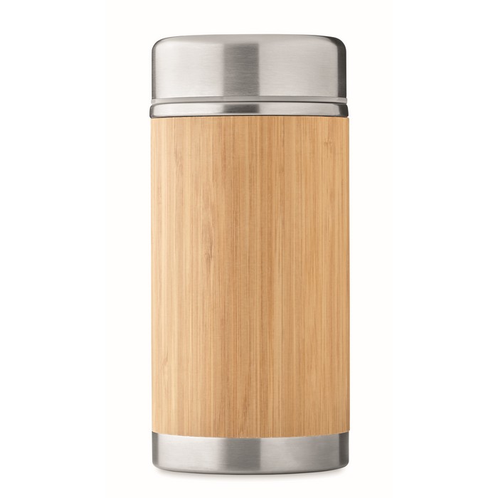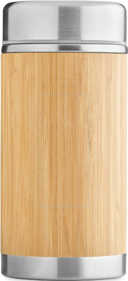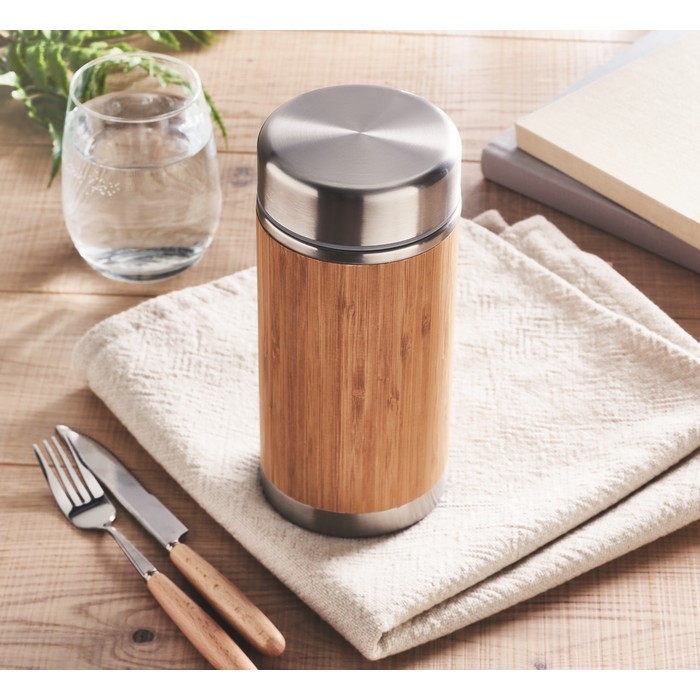 Double wall stainless steel insulated food jar with a screw top in bamboo finish. Capacity: 600 ml.