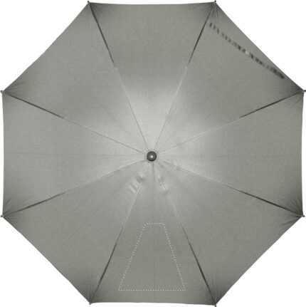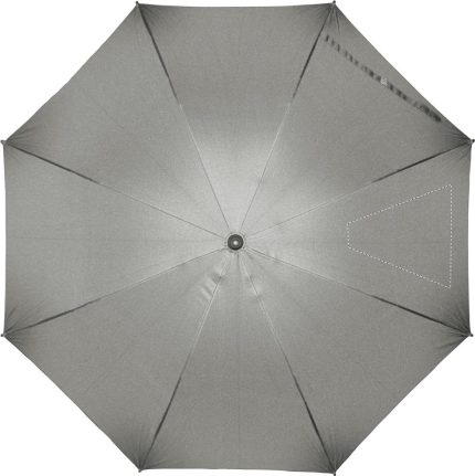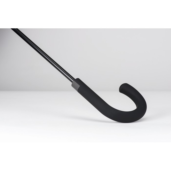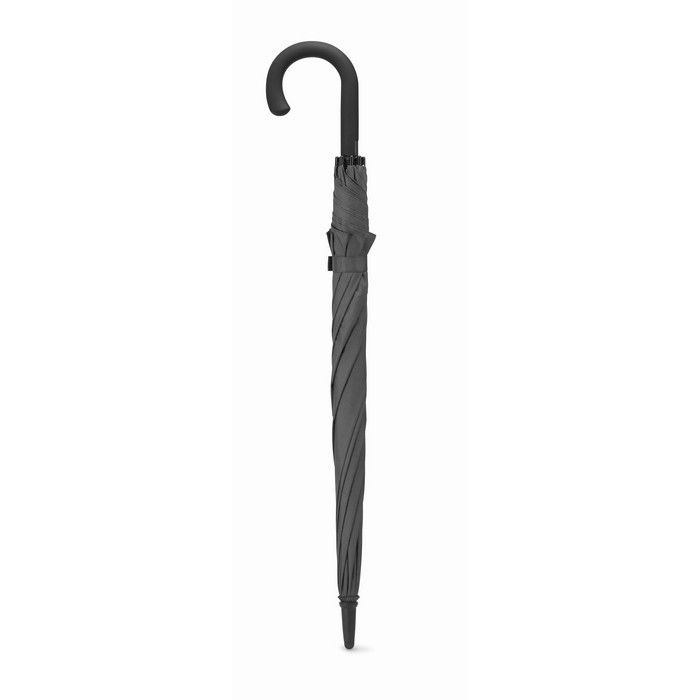 23 Inch auto open windproof umbrella in 190T pongee with black plated metal shaft. Black fiberglass ribs and black plastic tips. Curved black rubberised ABS handle with grey button. Manual closure.