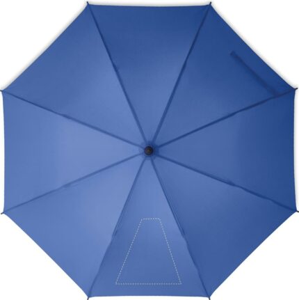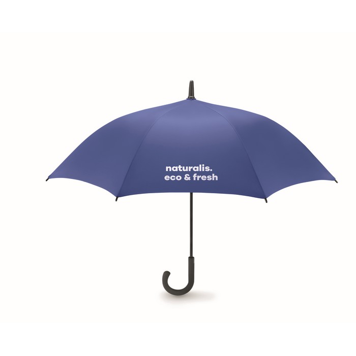 23 Inch auto open windproof umbrella in 190T pongee with black plated metal shaft. Black fiberglass ribs and black plastic tips. Curved black rubberised ABS handle with grey button. Manual closure.