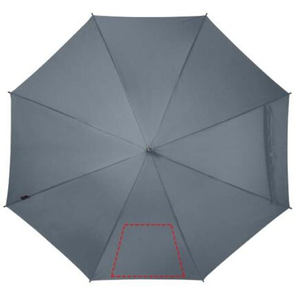 23” automatic opening umbrella with a recycled PET pongee polyester canopy. It has a sturdy metal shaft, fiber glass frame, and a comfortable EVA handle with colour matching end. Large print area on each of the panels.