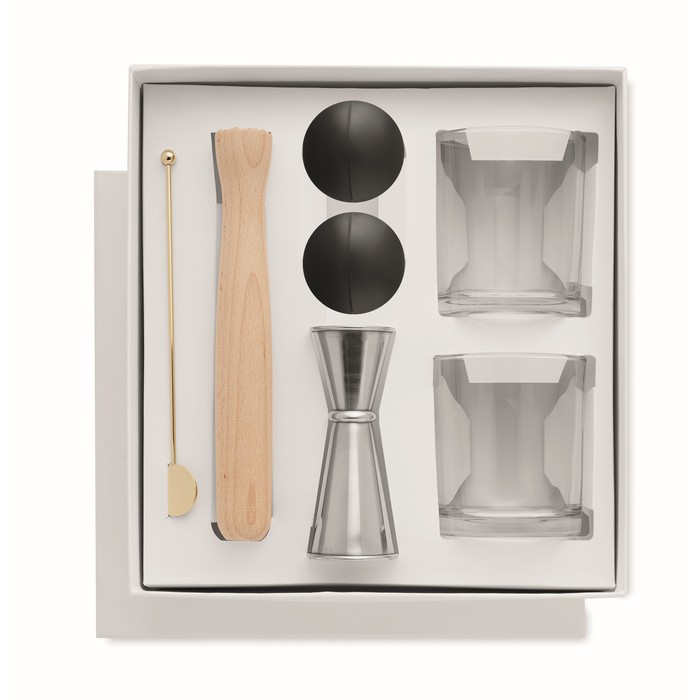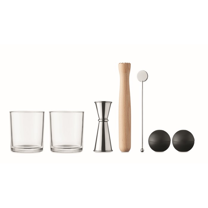 Cocktail glass set. Includes 7 piece: two tumblers, double-sided stainless steel jigger (25&50 ml), wooden muddler, stainless steel drink stirrer and two sphere silicone ice moulds.