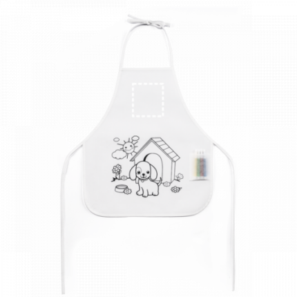 Non-woven kids apron (80/m²) with drawing to colour, side pocket and adjustable straps. Includes 4 markers. 380 x 430 mm