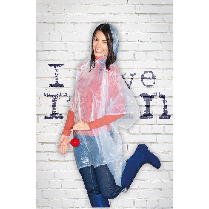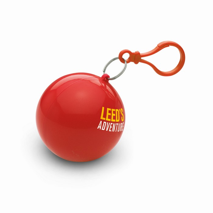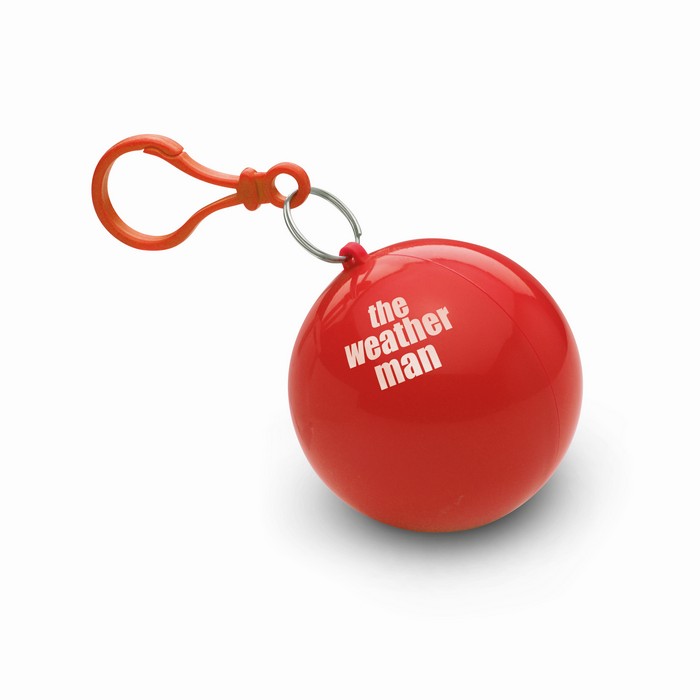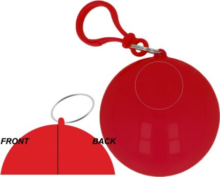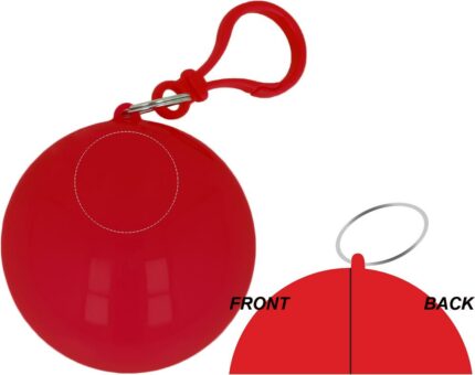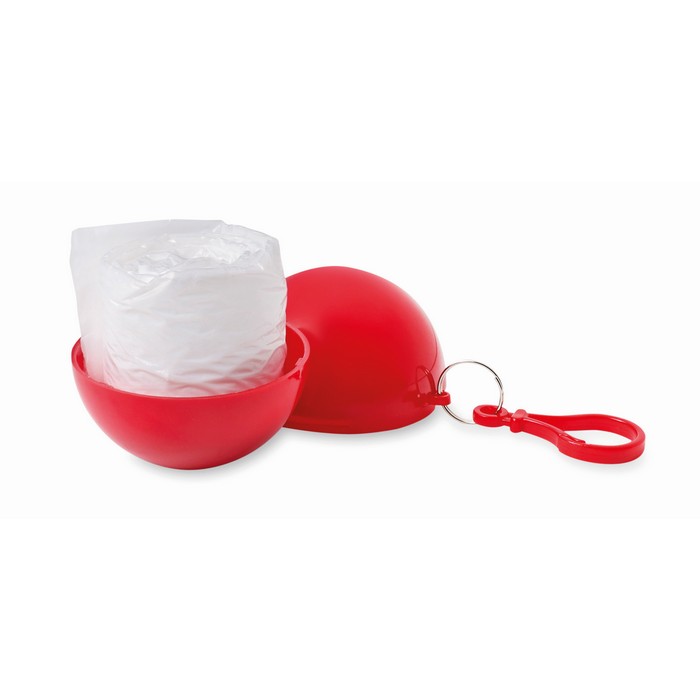 Transparent PE poncho wrapped in an AS ball shell with carabiner hook to hang on a belt or a bag.