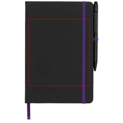 Modern and stylish black notebook, with a soft-feel tactile cover. Supplied with coloured edging and matching coloured page marker, pen loop and closure strap. Supplied with a plain black stylus ballpoint pen. Inlcudes 96 sheets (70g/m2) cream lined paper.