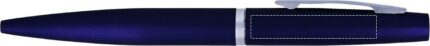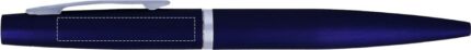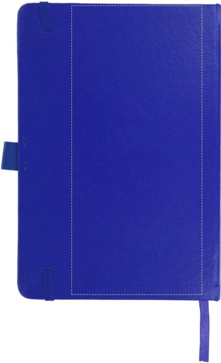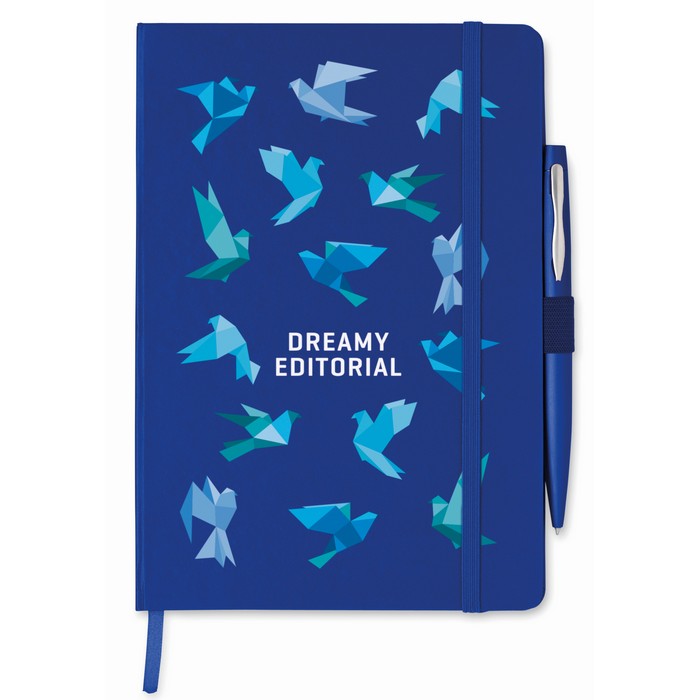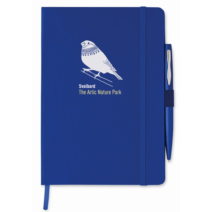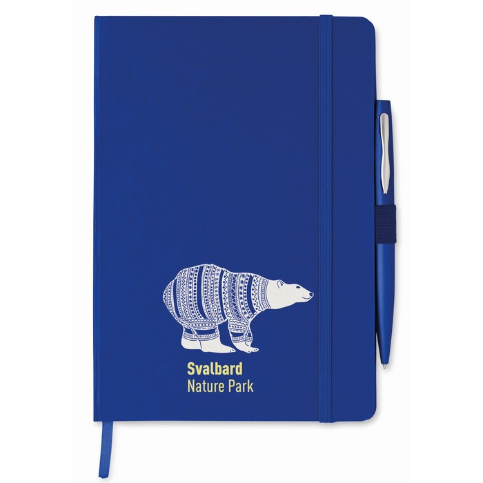 A5 notebook with pen. Hard PU cover. Casebound. 144 lined pages (72 sheets). Matching elastic closure strap, ribbon bookmark and pen holder. Matching metal push button ball pen. Blue ink.