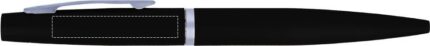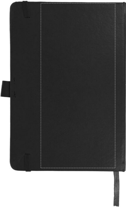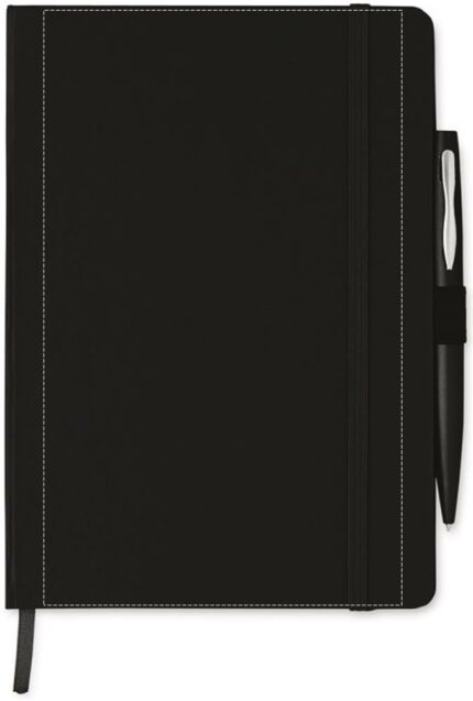 A5 notebook with pen. Hard PU cover. Casebound. 144 lined pages (72 sheets). Matching elastic closure strap, ribbon bookmark and pen holder. Matching metal push button ball pen. Blue ink.