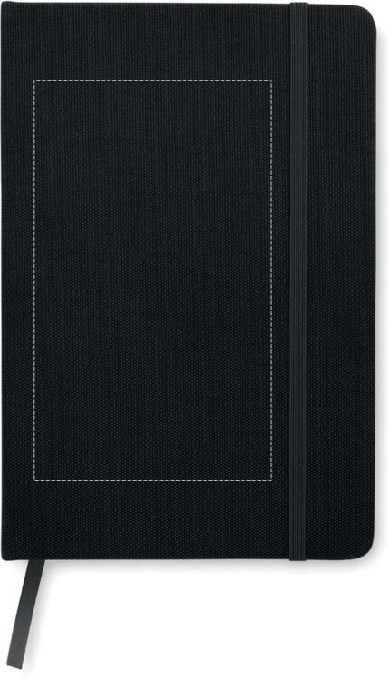 A5 notebook with hard 600D RPET cover. Casebound. 160 lined recycled paper pages (80 sheets). Matching elastic closure strap and ribbon bookmark.