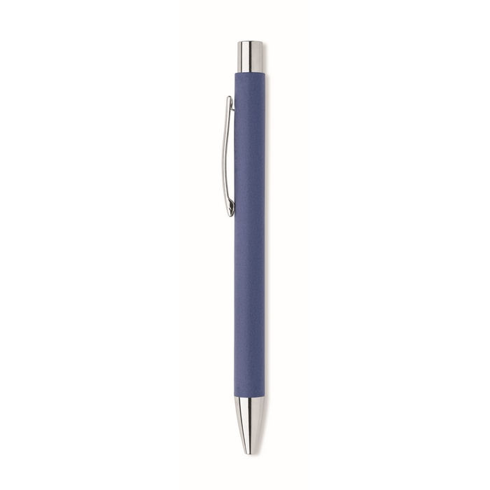 Push button ball pen in recycled paper and metal clip and plastic fittings. Blue ink.